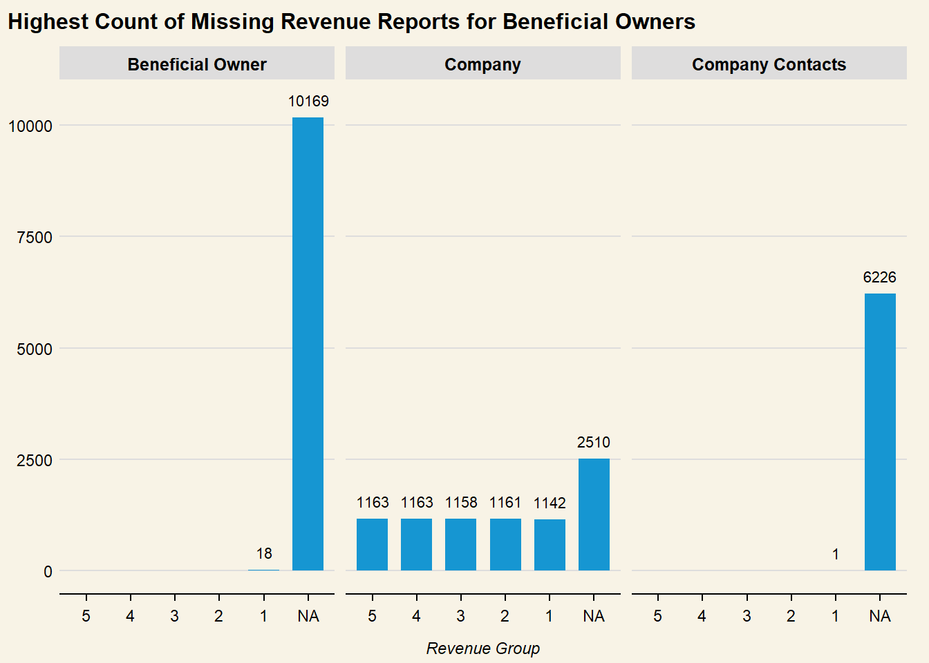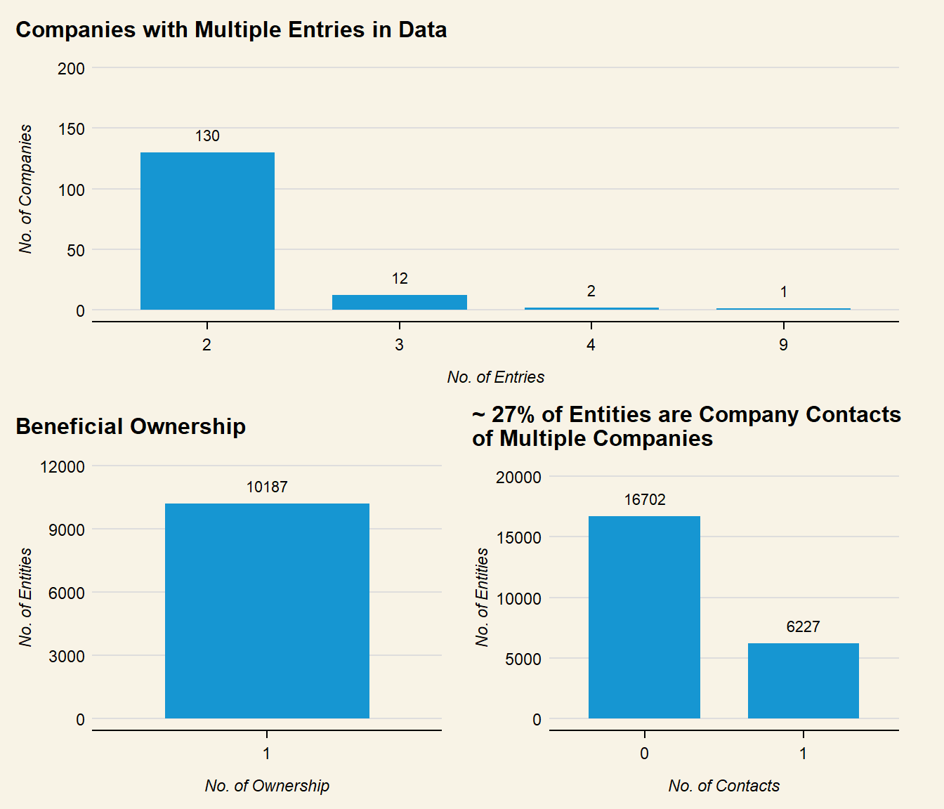 nodes_by_type <- mc3_nodes_new %>%group_by(id, type) %>%summarise(count =n()) %>%# Pivot to get each type as a separate columnpivot_wider(names_from = type, values_from = count, values_fill =0) %>%arrange(desc(Company)) %>%ungroup()company_plot <- nodes_by_type %>%# Only get count of nodes with multiple company entriesfilter(Company >1) %>%# Show discrete count labels in x axismutate(Company =as.factor(Company)) %>%ggplot(aes(x = Company) ) +geom_bar() +labs(title ="Companies with Multiple Entries in Data",x ="No. of Entries",y ="No. of Companies" ) +geom_text(stat ="count",aes(label =after_stat(count)),vjust =-1 ) +ylim(0, 200) +theme(text =element_text(size =12),plot.background =element_rect(fill="#F8F3E6",colour="#F8F3E6") )owner_plot <- nodes_by_type %>%# Only find nodes that are ownersfilter(`Beneficial Owner`>0) %>%# Show discrete count labels in x axismutate(`Beneficial Owner`=as.factor(`Beneficial Owner`)) %>%ggplot(aes(x =`Beneficial Owner`) ) +geom_bar() +labs(title ="Beneficial Ownership",x ="No. of Ownership",y ="No. of Entities" ) +ylim(0, 11500) +geom_text(stat ="count",aes(label =after_stat(count)),vjust =-1 ) +theme(text =element_text(size =12),plot.background =element_rect(fill="#F8F3E6",colour="#F8F3E6") )cc_plot <- nodes_by_type %>%# Show discrete count labels in x axismutate(`Company Contacts`=as.factor(`Company Contacts`)) %>%ggplot(aes(x =`Company Contacts`) ) +geom_bar() +labs(title ="~ 27% of Entities are Company Contacts\nof Multiple Companies",x ="No. of Contacts",y ="No. of Entities" ) +geom_text(stat ="count",aes(label =after_stat(count)),vjust =-1 ) +ylim(0,20000) +theme(text =element_text(size =12),plot.background =element_rect(fill="#F8F3E6",colour="#F8F3E6") )patch <- owner_plot + cc_plot full_patch <- company_plot / patchfull_patch &theme(plot.background =element_rect(fill="#F8F3E6",colour="#F8F3E6"))