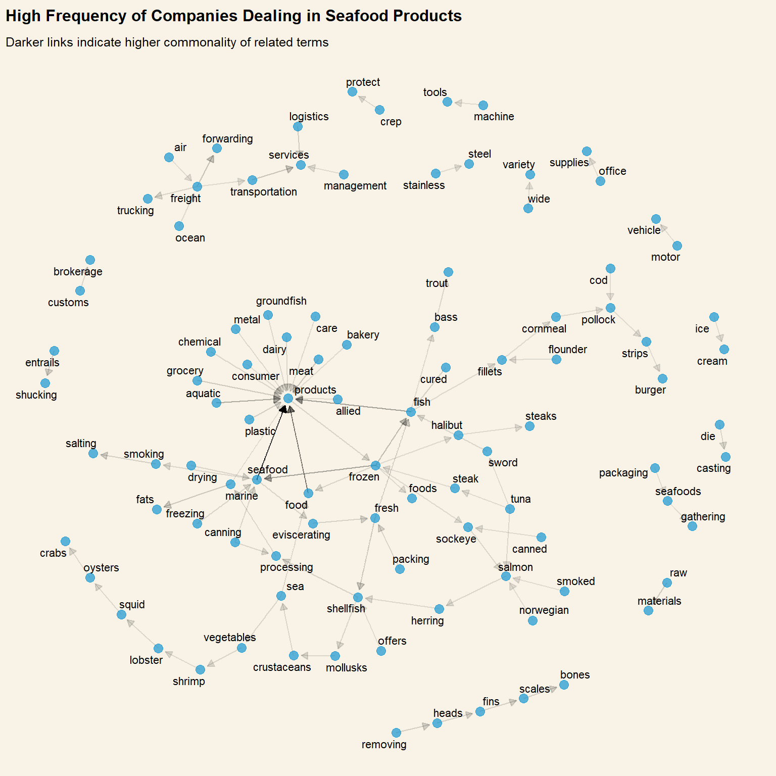 set.seed(1234)ggraph( product_bigram_graph, layout ="nicely" ) +geom_edge_link(# Adjust transparency of link based on how common the bigram isaes(edge_alpha = n),arrow = grid::arrow(type ="closed", length =unit(.2, "cm")),# Leave a gap between arrow head and circleend_cap =circle(.2, 'cm'),show.legend =FALSE ) +geom_node_point(alpha = .7,size =3) +geom_node_text(aes(label = name), repel =TRUE ) +labs(title ="High Frequency of Companies Dealing in Seafood Products",subtitle ="Darker links indicate higher commonality of related terms" ) +theme(plot.background =element_rect(fill="#F8F3E6",colour="#F8F3E6") )